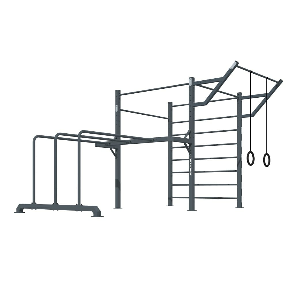 Struttura Calisthenics con spalliera, sbarre per trazioni, supporto per anelli e parallele triple.
