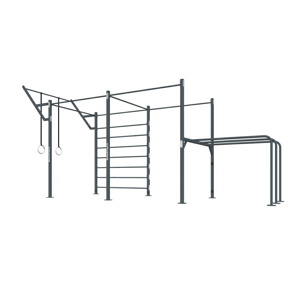 Struttura Calisthenics con spalliera, sbarre per trazioni, supporto per anelli e parallele triple.